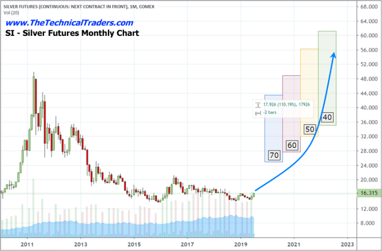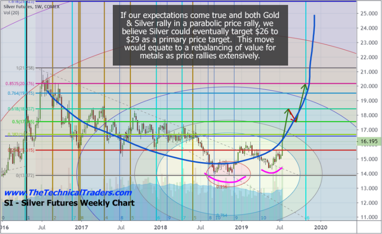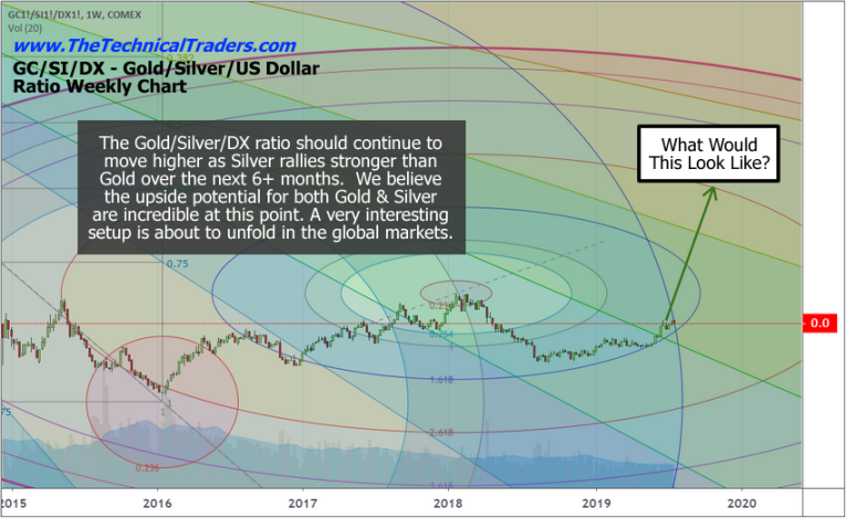 This Gold/Silver/US Dollar ratio chart is the basis of our analysis for the reversion process event and the associated revaluation event. Our previous analysis suggests Gold will attempt a move to levels above $1650 to $1700 on the next breakout move higher. This next upside price move will expose the price reversion event for all traders to witness and we have mapped out the expected Silver price advantage for all traders going forward.