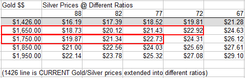For every drop of 5.0 points in the gold/silver ratio, the price of Silver should increase by 6.5% to 7.5% to the price of Gold.