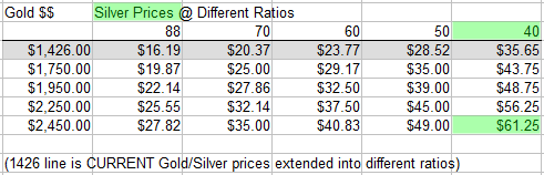 Imagine where Silver could go if the ratio level fell to levels below 40 and gold rallied to $2500 or more? Ok, stop imagining and take a look at this second extended ratio table.
