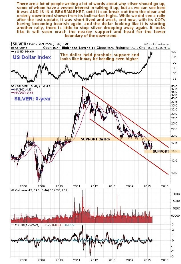 There are a lot of fine words being written about how attractive silver is at current prices and how it is about to enter a new bull market etc, but the plain truth is that it remains in a major downtrend and is a bear market until it breaks out of it.