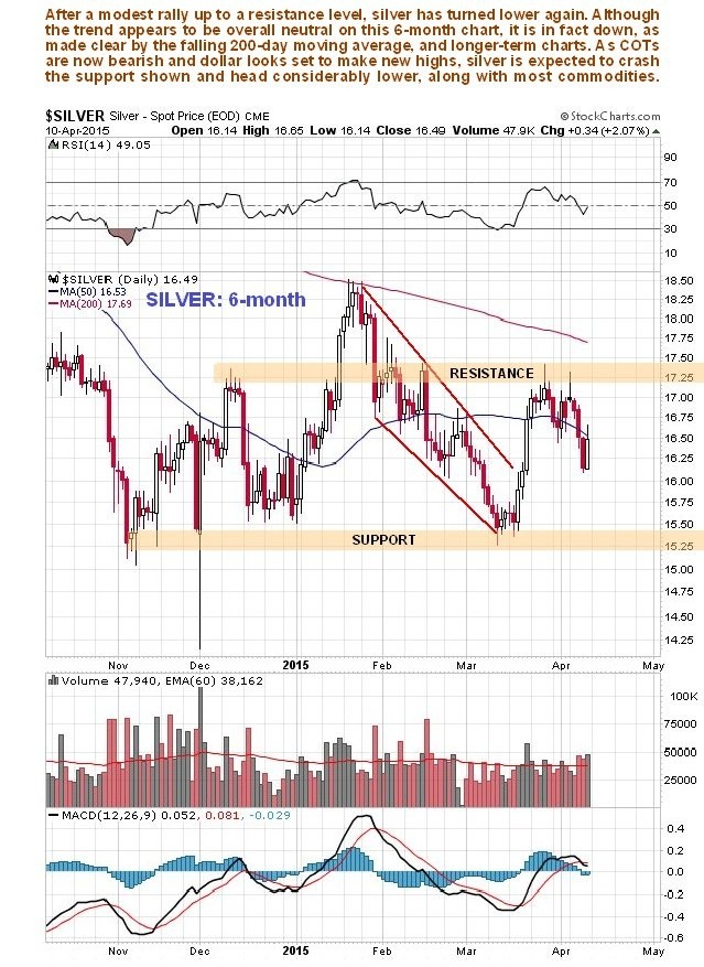 On its 6-month chart we can see that after a short-lived and feeble rally, silver got turned back by a resistance level and is in retreat again from a minor top. Moving averages are in bearish alignment. With its COT having turned negative again, and the dollar looking like it is starting another upleg, silver looks set to drop back initially to the support in the $15.20 - $15.40 area, before breaking below this to head down towards the lower boundary of the channel shown on the 8-year chart.