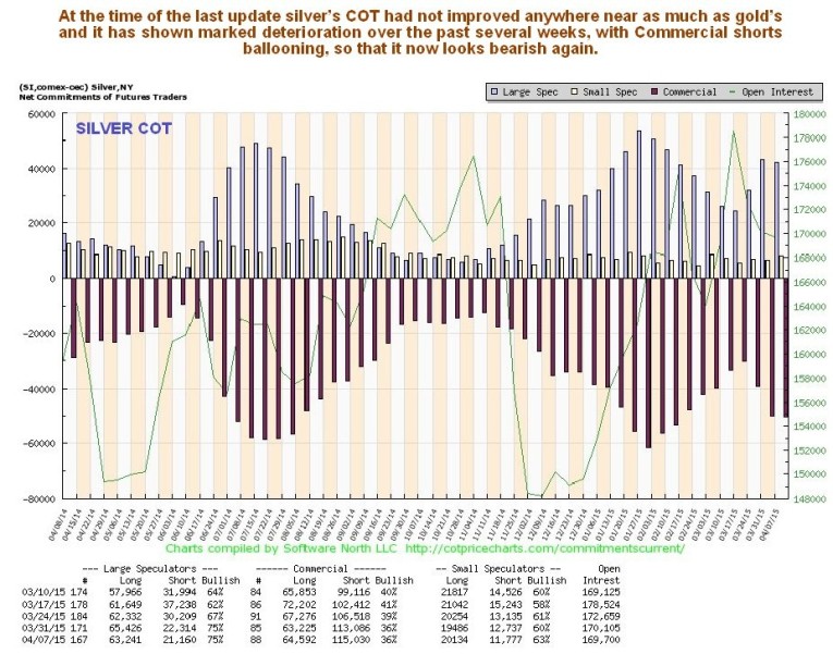On the latest COT chart we can see how Commercial short positions have ballooned rapidly over the past several weeks to reach levels that are definitely bearish – silver now looks set to take a serious hit.