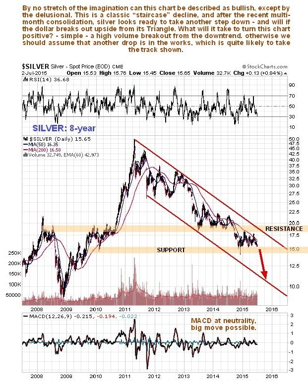 Silver’s cheerleaders are trying to keep their flocks happy by talking it up as usual, but the hard reality is that silver’s charts continue to look awful, and like it is readying for another sharp drop, which fits with our view that the dollar is getting ready for another big up-leg.