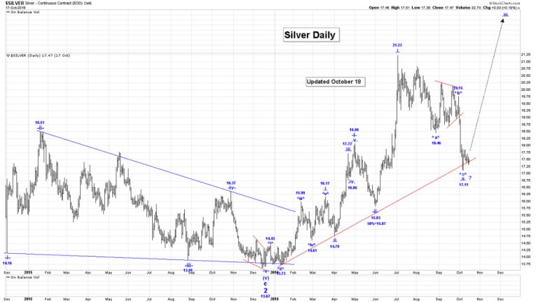 Silver does not have the bearish triangle formation within its Intraday Chart. Moreover, a break above the 17.85 high would be good sign that silver may have bottomed at the 17.11 low, and completed all of wave .ii.!