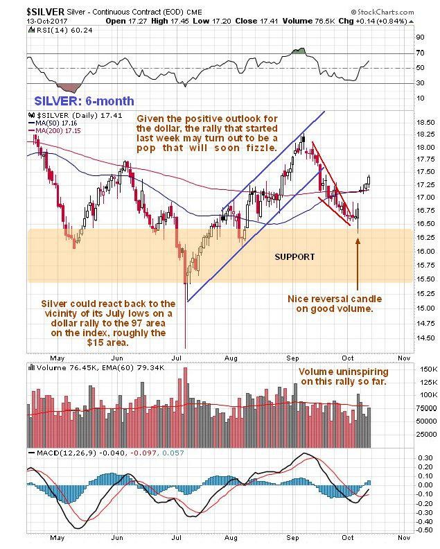 Like gold, silver gapped out of its downtrend last week, but volume was lacking on this move, which, given the now bullish outlook for the dollar, may turn out to be a “pop” that will be followed by renewed decline. This breakout was predicted in the last update, when it was pointed out that silver’s COTs were still far from outright bullish.