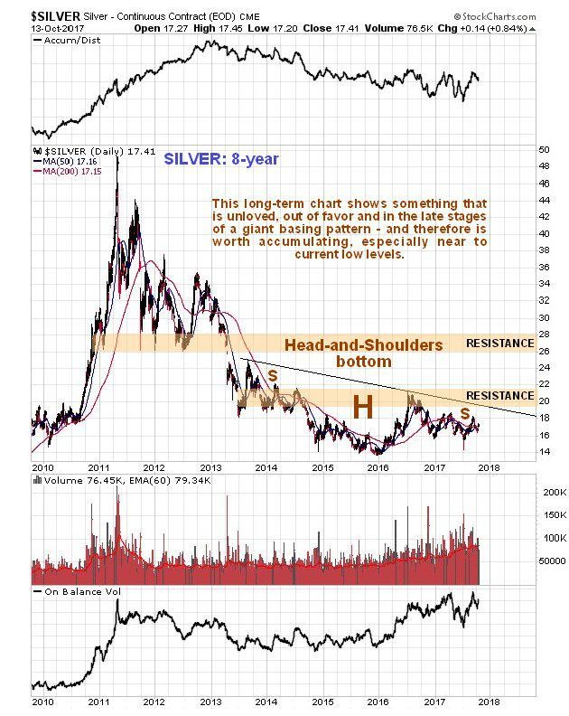 Like gold, silver is marking out a giant Head-and-Shoulders bottom pattern, but in silver’s case it is downsloping as we can see on its 8-year chart below, which reflects the fact that silver tends to underperform gold at the end of sector bearmarkets and during the early stages of sector bullmarkets. Prolonged underperformance by silver is therefore a sign of a bottom. This chart really does show how unloved silver is right now, but although the price has drifted slightly lower over the past several years, volume indicators have improved, especially this year, a positive sign. A break above the neckline of the pattern, the black line, will be a positive development, and more so a break above the band of resistance approaching the 2016 highs. Once it gets above this it will have to contend with a quite strong zone of resistance roughly between $26 and $28. Silver is amongst the most unloved of all metals, a situation that is not expected to continue, partly because silverbugs are manic-depressive and they have been depressive for a long time, meaning that it surely won’t be all that long until they are on the rooftops singing Happy Days are Here Again, although it now looks like they will have to put up with another retreat by silver first as the dollar stages a relief rally.