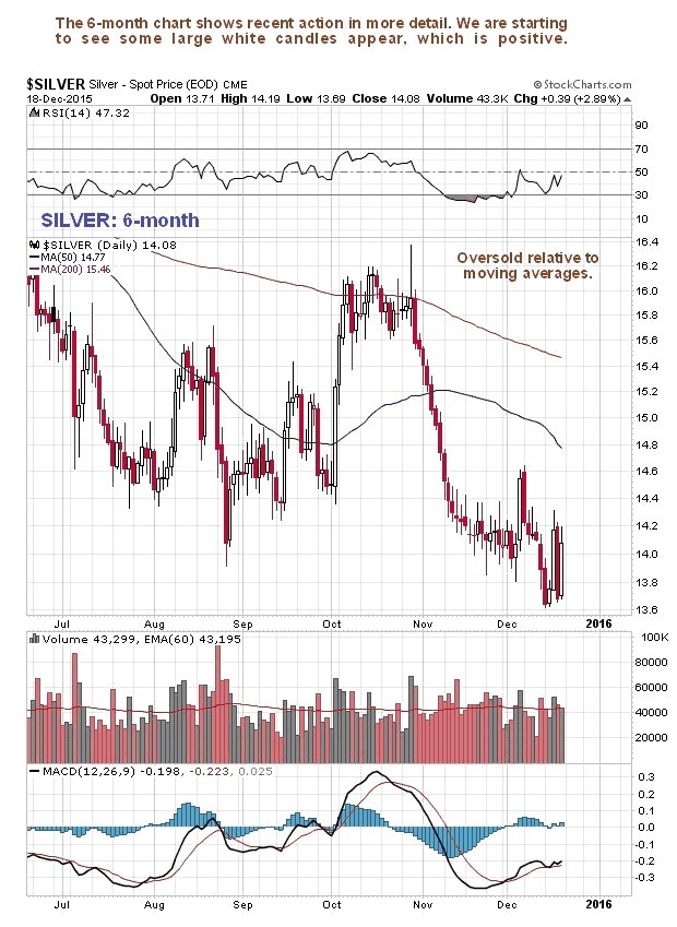 Silver has been somewhat weaker than gold in the recent past and dropped to clear new lows last Monday, as we can see on its 6-month chart below, but this should not come as a surprise as its recent COT structure has been nowhere near as positive as gold's, and at the end of a bear market or beginning of a bull market, gold outperforms silver.
