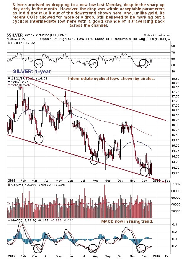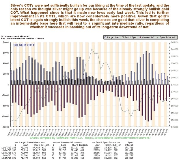 Although silver made clear new lows last week, it did not change the overall picture from the last update, which is of silver marking out a probable intermediate base pattern that should lead to a tradable rally, as we can see on its 1-year chart below. On this chart we can see that it is near to the bottom of the downtrend channel shown within which there is plenty of room for a tradable rally, even if it doesn't succeed in breaking out of this channel. Silver's latest COTs are certainly supportive of such a rally now, and these are bolstered by gold's strongly bullish COTs.
