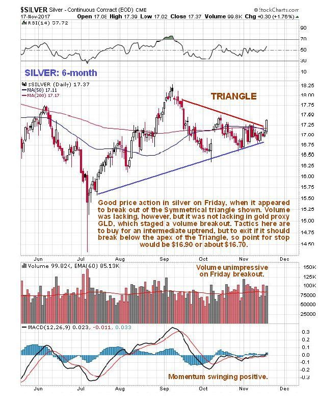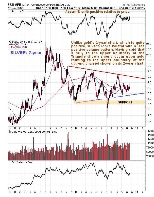 At the same time that gold broke out of a coiling pattern to the upside on Friday, silver broke out of a Symmetrical Triangle pattern shown on its 6-month chart below. Volume was lacking on this breakout, however, and the same reservations that apply to the outlook for gold also apply to silver, namely that its COTs look more bearish then bullish, and that Hedgers positions in the dollar index are still calling for it to rally. On the other hand, gold proxy GLD did make a volume breakout on Friday, and what’s good for gold is usually good for silver. Although these conflicting factors make the situation somewhat ambiguous, there is a favorable trading setup here, because silver is still quite close to the apex of the Symmetrical Triangle, so it is possible to open long positions with fairly close stops beneath the apex of the triangle in case the breakout was false. Gold’s price pattern now looks quite favorable, with it looking set to run to a resistance level towards the top of an uptrend channel, and if that happens, silver should follow suit and advance towards its early September highs at about $18.25, perhaps stopping short at about $18.00 for a reason we will observe on its 2-year chart. Point for a stop for traders going long is about $16.70.