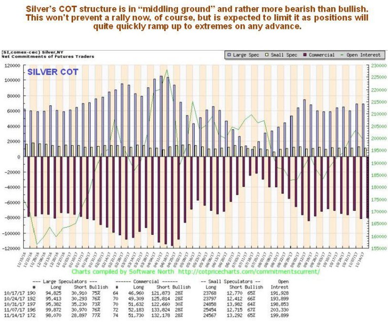 Although a near-term rally in silver in sympathy with gold looks quite likely, we can see why it is unlikely to get very far on its latest COT chart. COT positions on this chart look more bearish than bullish, and any near-term rally is likely to quickly take them to extremes.