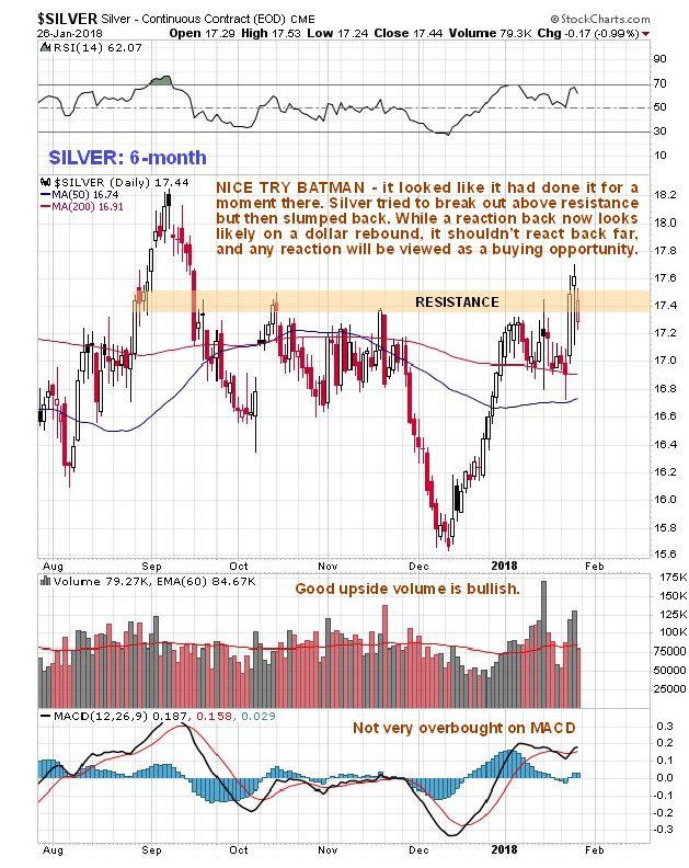 On silver’s latest 6-month chart we can see that it made a plucky but short-lived attempt to break above a line of resistance in the $17.30 - $17.50 zone last week. It failed and is now vulnerable to reacting back on a short-lived dollar relief rally, although it shouldn’t drop far, probably no lower than $16.80, and any such drop will be viewed as presenting a buying opportunity, especially in the better silver stocks.