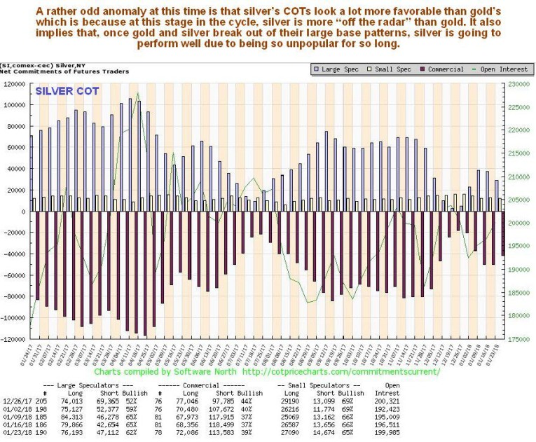 The latest COT for silver is considerably better looking than the latest COT for gold, which is rather surprising, and is viewed as an indication that any reaction will be minor, and also supports our contention than when silver does break out of its base pattern, the resulting rally could be sharp.