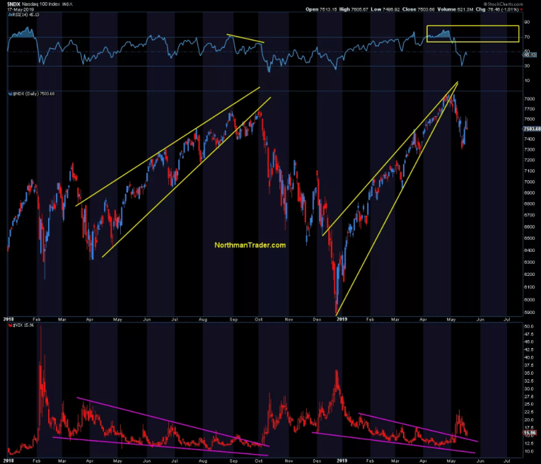 A perfect example of a rising wedge is shown in one of the Northman Trader’s (Sven Heinrich) charts on the NASDAQ a few weeks ago: