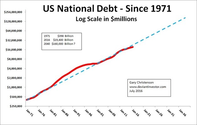 Current US official national debt is about $19.4 trillion. Unfunded liabilities are five to ten times higher. Do we really believe that the exponential growth of debt, which will probably accelerate in coming years, can reach $160 Trillion in the year 2040 or thereabouts? A prior reset seems likely!