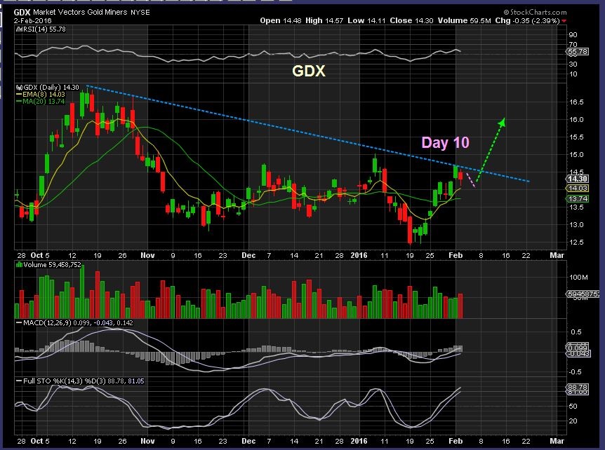 GDX Tuesday – On day 10 and at resistance, it is strong but stalled for a moment. Can it break out?