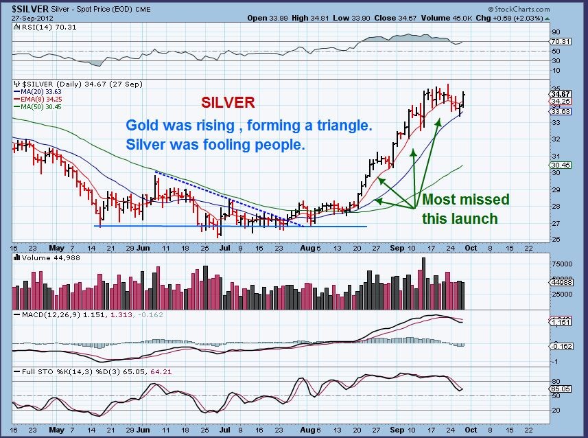 SILVER fooled people into thinking that it was “Weak?” Gold was rising in May, June, July, Aug with higher lows , but Silver was not. Notice the triangle though.