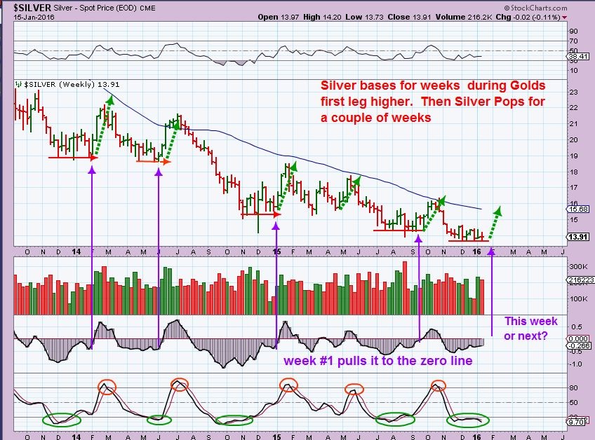 My Jan 15 chart – This is why I tell my readers that I think Silver will continue higher. I use a special indicator that is lining up as expected. The pattern of Basing & then the surge happens, even in bear market rallies. We’re basing, how about the pop?