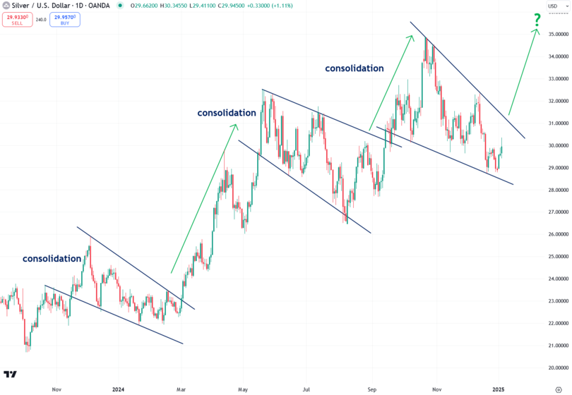 If history repeats itself, and a breakout occurs, silver could be poised for another strong rally, just as it did following the previous consolidation periods.