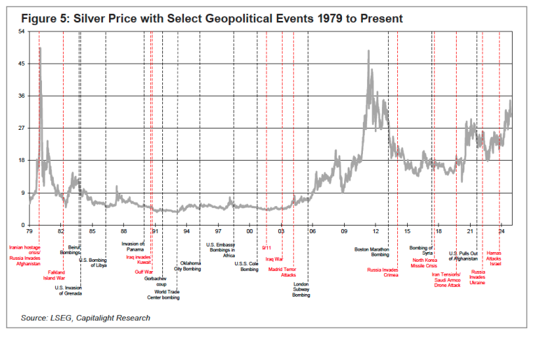 Capitalight analyzed silver’s performance during several geopolitical upheavals dating back to 1979.