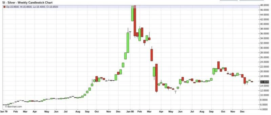 In 1980, the silver price moved from $10 an ounce to $48 in just four months. Two months later, it was back at $10.