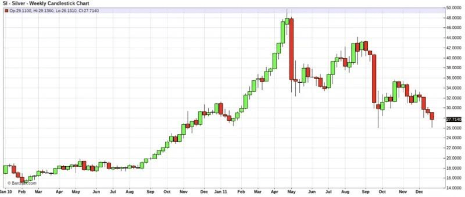Starting in late 2010, silver rallied again, hitting $48 in eight months. But again, it quickly gave up those gains, falling to $26 in just a few months.
