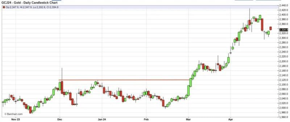 As you might recall, gold finally cracked strong resistance at $2,000 an ounce in December 2023 and surged to $2,100. Then we saw a sharp reversal. Just 17 days later, gold eclipsed $2,100 again before once again selling off. Over the next several months, gold was rangebound in the $2,000 an ounce range before breaking out and surging higher again in March 2024.