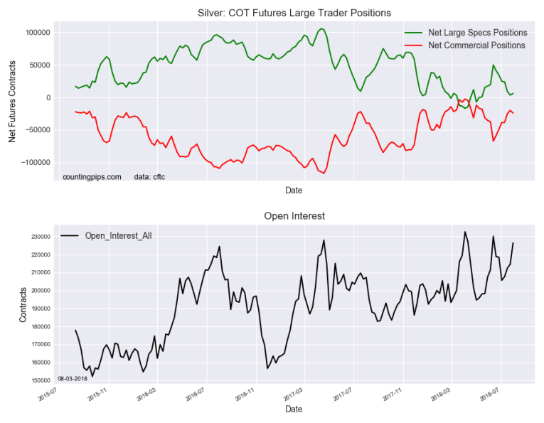 The non-commercial futures contracts of Silver futures, traded by large speculators and hedge funds, totaled a net position of 5,864 contracts in the data reported through Tuesday July 31st. This was a weekly advance of 2,326 contracts from the previous week which had a total of 3,538 net contracts.