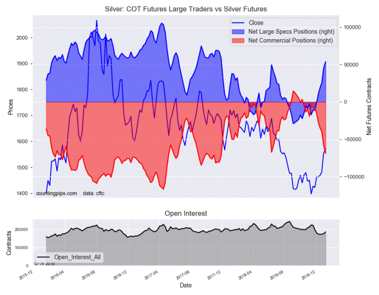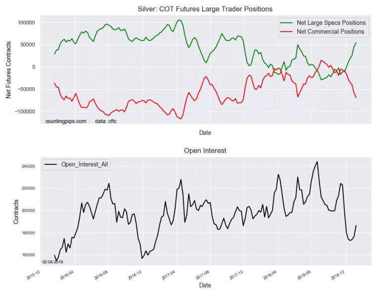 The non-commercial futures contracts of Silver futures, traded by large speculators and hedge funds, totaled a net position of 54,023 contracts in the data reported through Tuesday, January 8th. This was a weekly gain of 9,064 net contracts from the previous week which had a total of 44,959 net contracts.