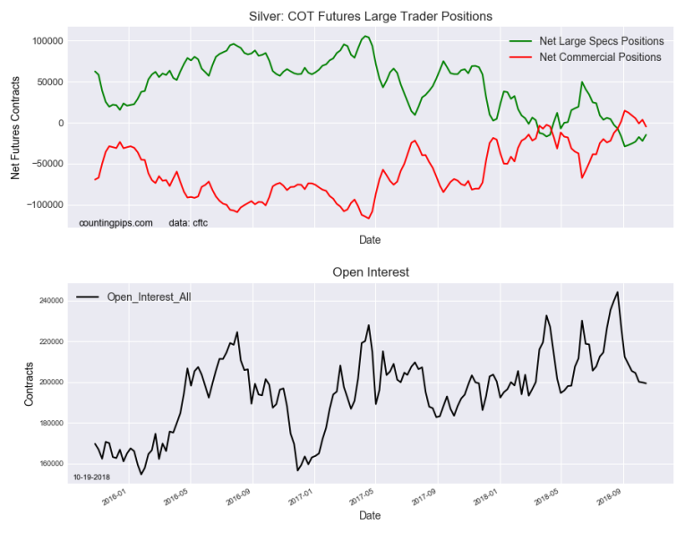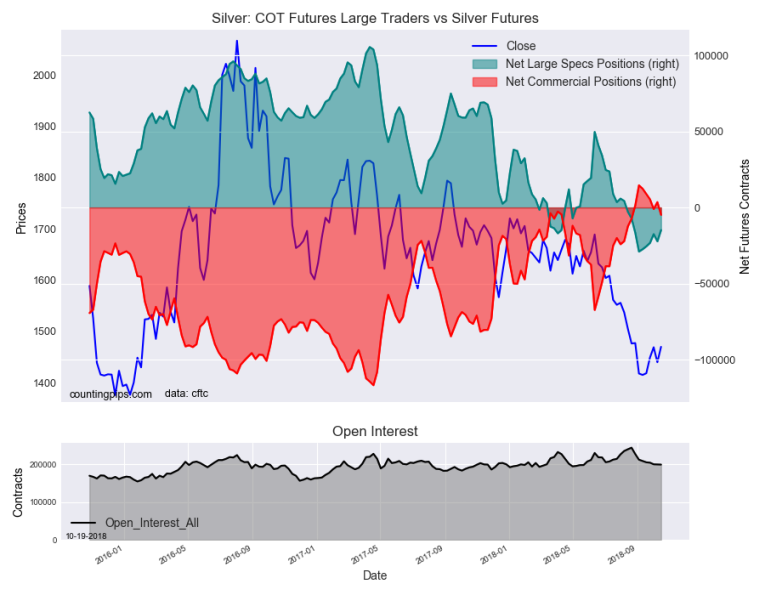 The non-commercial futures contracts of Silver futures, traded by large speculators and hedge funds, totaled a net position of -14,827 contracts in the data reported through Tuesday October 16th. This was a weekly advance of 7,423 contracts from the previous week which had a total of -22,250 net contracts.