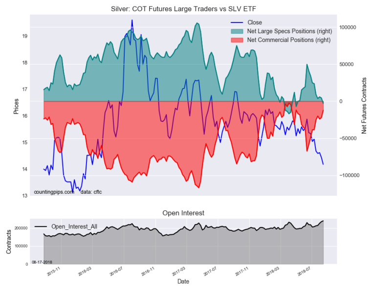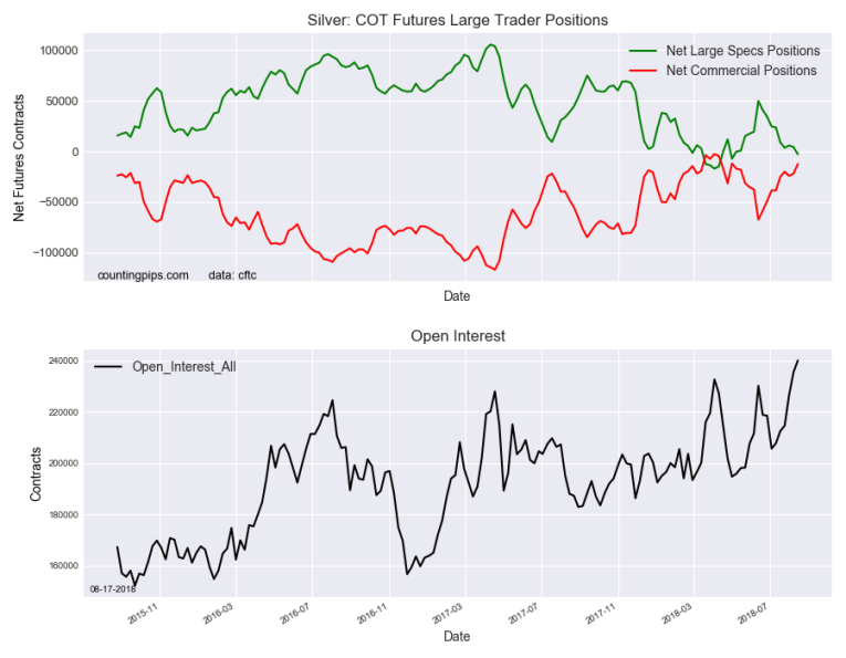 The non-commercial futures contracts of Silver futures, traded by large speculators and hedge funds, totaled a net position of -2,836 contracts in the data reported through Tuesday August 7th. This was a weekly reduction of -7,177 contracts from the previous week which had a total of 4,341 net contracts.