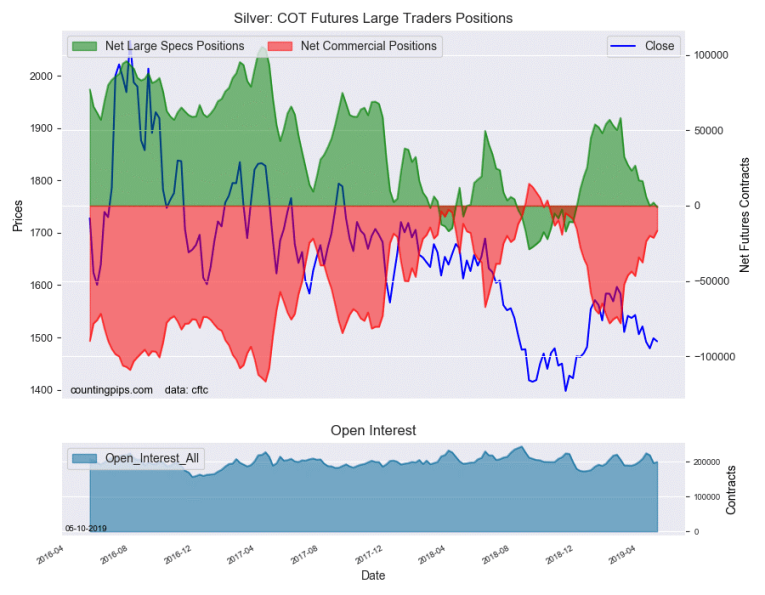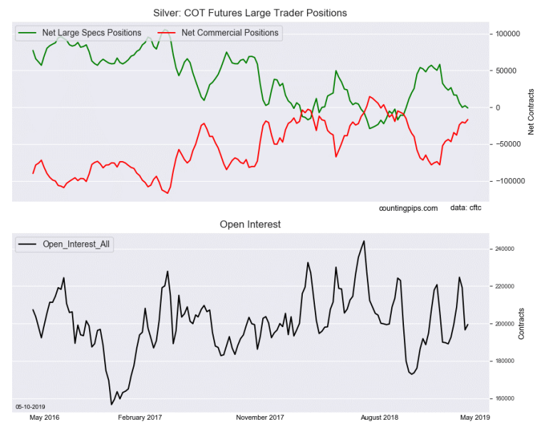 The non-commercial futures contracts of Silver futures, traded by large speculators and hedge funds, totaled a net position of -957 contracts in the data reported through Tuesday, May 7th. This was a weekly lowering of -3,093 net contracts from the previous week which had a total of 2,136 net contracts.