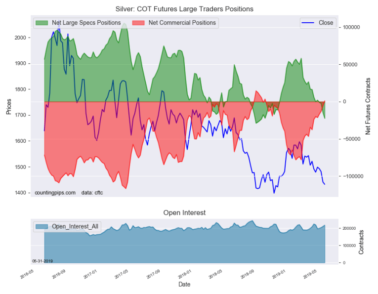 The non-commercial futures contracts of Silver futures, traded by large speculators and hedge funds, totaled a net position of -22,409 contracts in the data reported through Tuesday, May 28th. This was a weekly change of -7,747 net contracts from the previous week which had a total of -14,662 net contracts.