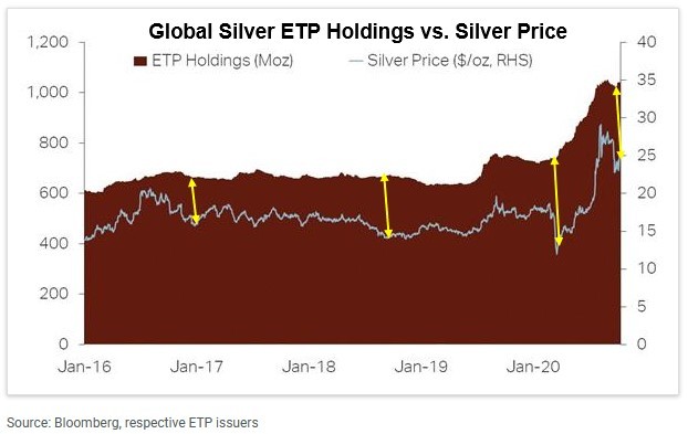 It’s certainly clear from the above chart that silver ETF investments tend to be what’s called “sticky money”. That means when investors buy, they tend to hold, even through price drops and even through significant ones. I’ve highlighted this phenomenon with yellow arrows in the above chart. Even as silver prices sold off several times since 2016, silver ETF holdings remained rather stable. The most dramatic example of this was last March when silver plunged temporarily to $12, while ETF holdings barely budged.