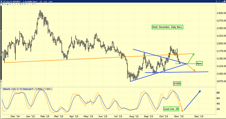 That’s the daily gold chart. I suggested gold would quickly decline to the $1130 apex area of a beautiful symmetrical triangle, and that’s exactly what has happened. Gold is trading at about $1131 this morning.