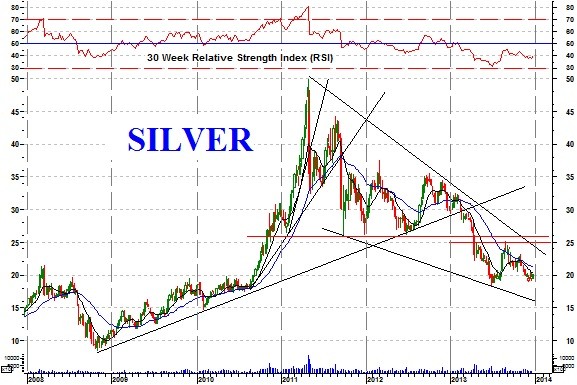 In this periodic issue of Technically Precious with Merv I thought I’d look in on where silver (and silver stocks) is right now and see if there is any hope in the future. As most of my readers know, I have no knowledge of the fundamentals behind any of this. I just look at the charts of the daily and weekly activities of thousands of traders and try to decipher what’s going on in their minds. THEY are acting with their money not just spouting words, and money usually talks.