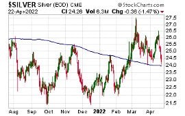 The adjacent chart shows silver’s recent price action against its 200-day moving average line.