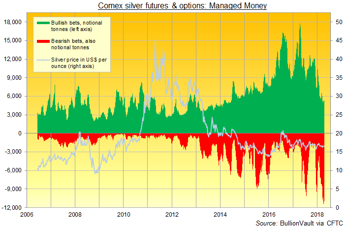 The last 9 weeks of bearish speculation in Comex futures and options, in contrast, have seen silver prices slip less than 2%.
