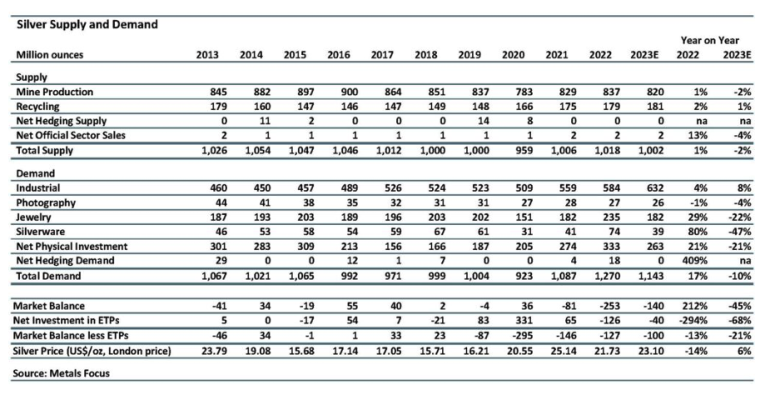 With a combination of historically high demand and falling mine output, the Silver Institute projects a 140 million-ounce market deficit in 2023.
