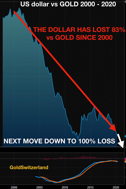 The situation today is even worse. In the 50 years between 1971 and today, the dollar has lost 98% of its real value, measured in gold. The fall is now accelerating as the graph below shows. The dollar has lost a staggering 83% in the last 20 years since 2000.