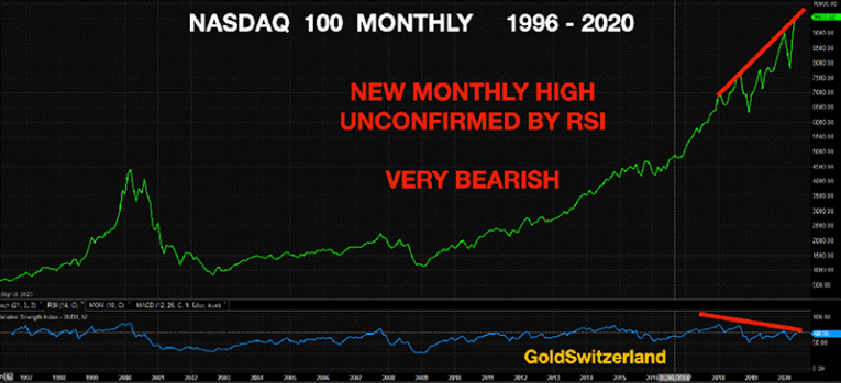 The Relative Strength Index at the bottom of the chart has not confirmed the Nasdaq new highs since 2018. This is a very bearish signal which almost without exception leads to a crash.