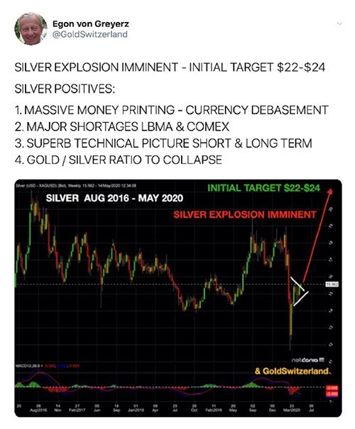 Silver was at $15.56 at the time of the Tweet and is now $18.30.