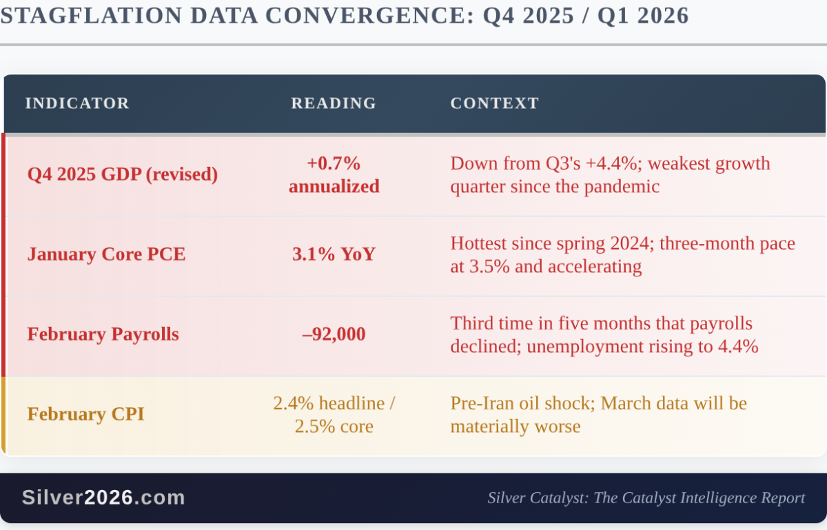 The dot plot from tomorrow's FOMC may be the single most market-moving release for silver in the near term. Whether the median Fed projection shifts to zero cuts (hawkish, dollar-positive, temporary headwind) or two cuts (dovish, silver-positive) will determine the near-term direction. Either way, the stagflation setup that Catalyst #65: 1970s Stagflation Precedent Shows Extreme Performance anticipated is no longer theoretical. It's in the data, right now.