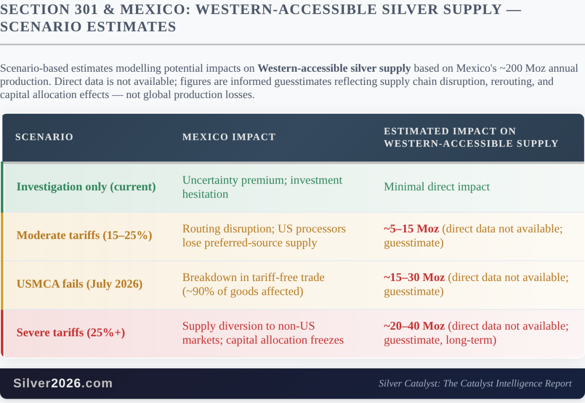 The supply risk scenarios depend heavily on how far the investigation escalates. The following estimates model potential impacts on Western-accessible silver supply — direct data is not available, so these are informed guesstimates based on Mexico's ~200 Moz annual output: