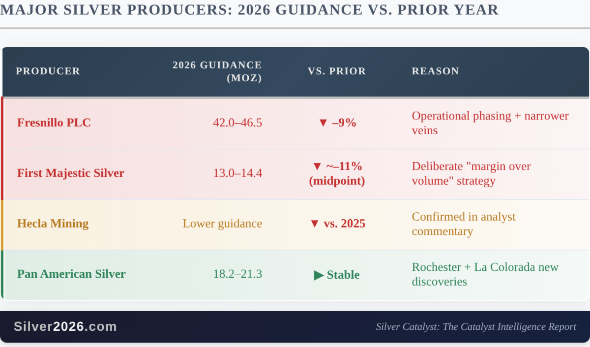 The combined documented shortfall from Fresnillo and First Majestic alone is approximately 5–6 million ounces at midpoints versus prior guidance. The consensus gap (comparing guidance against what the market had previously modeled) is considerably wider, with analysts estimating a 12–20 Moz shortfall from the top three primary producers versus expectations.