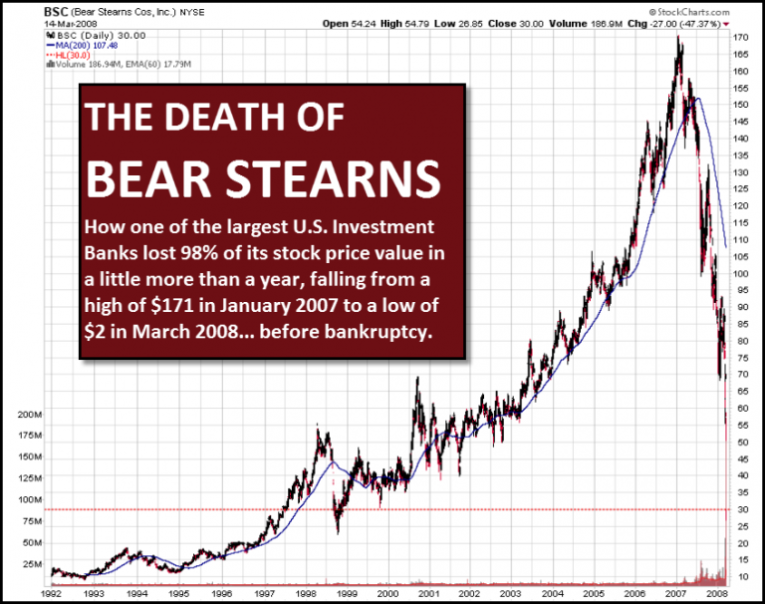 As Bear Stearns added more and more crappy MBS – Mortgage Backed Securities to its portfolio, the company share price rose towards the heavens. At the beginning of 2007 and the peak of the U.S. housing boom, Bear Stearns stock price hit a record $171. Unfortunately, at some point, all highly leveraged garbage assets or Ponzi Schemes come to an end. While the PARTY LIFE at Bear Stearns lasted for quite a while, DEATH came suddenly.
