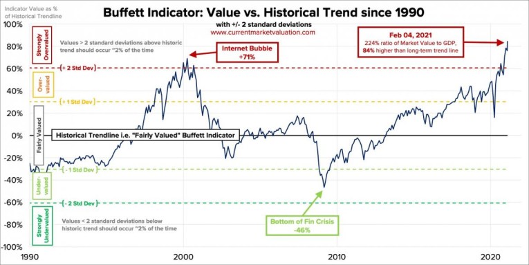 If you take the US stock market cap of $48.7 trillion and the estimated GDP of $21.7 trillion, we're nearly 224% overvalued and 84% above the historical average. This ratio has not been at a level like this since the dotcom bubble.