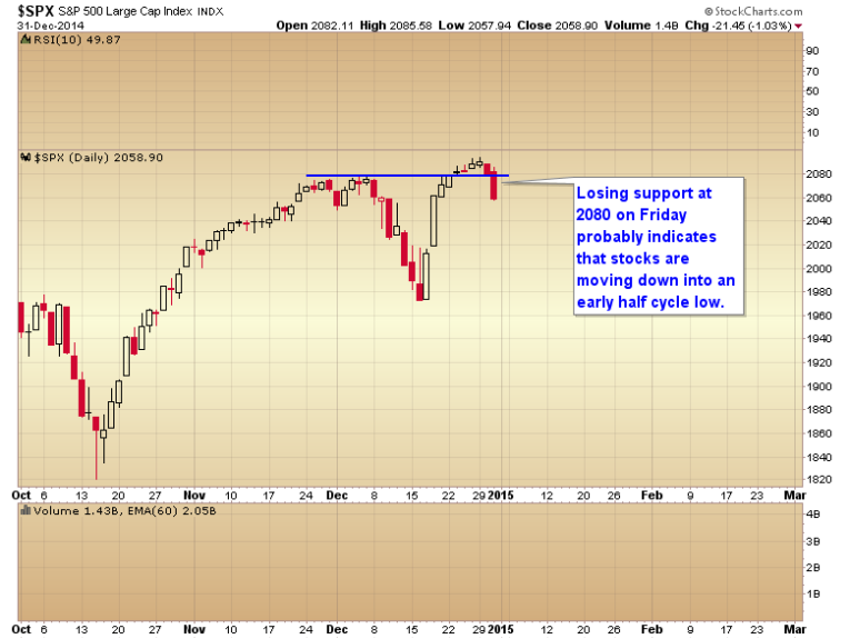 I had my doubts as to whether the market could break through 2100 on the first try--and Friday’s move has probably confirmed that it is not going to happen. With the market starting down into a half cycle low, along with an upcoming earnings season, ECB decision on QE (Jan. 22), and Greek vote (Jan. 25), I expect the stage is probably set for the market to chop sideways underneath 2100 for most of January before a brief breakout late in the month.