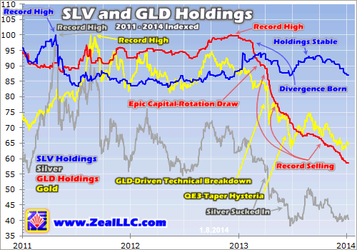 What if $2b or $5b or $10b of the vast pools of stock-market capital decide to buy silver low in the coming months through SLV? Professional investors and money managers are well aware that pretty much everything is already expensive except the loathed precious metals, so they are an obvious destination for a contrarian bet in 2014. Even minor SLV buying from stock traders will force silver to start soaring.
