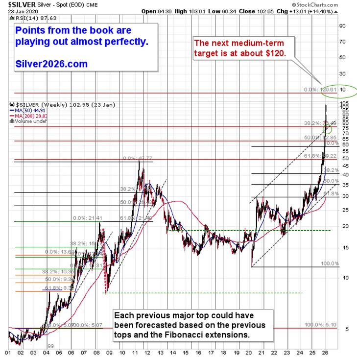 Silver price broke above $100 with vengeance, which means that $120 is the next target – simple as that. There are no other meaningful targets or resistance levels nearby.