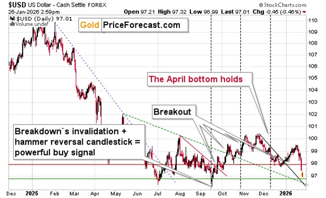 The USD Index declined sharply, and it’s likely a combination of concerns about this week and the aftermath of the Greenland threats. The latter seems to have been resolved – in tune with my previous indications – but the markets appear to be still reacting.